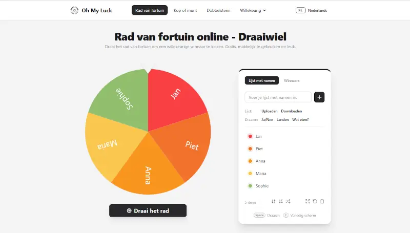 Een alternatief voor wheelofnames is de website https://ohmyluck.com/. Op deze website is niet alleen een woordspinner te vinden maar ook een dobbelsteen gooier en een kop of munt (flip the coin) pagina. Net zoals de bovenstaande website is ook deze vertaald naar meerdere talen en vereis deze website geen login of registratie.